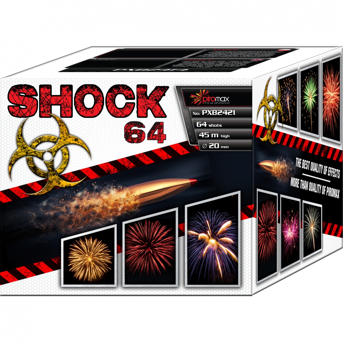 Bateria Shock 64-strzałowa Efekt: czerwona kometa przechodząca w brokatową koronę z czerwonym rozbłyskiem, czerwona kometa przechodząca w czerwoną gwiazdę ze stroboskopem, zielona kometa przechodząca w brokatową koronę z zielonym rozbłyskiem, zielona kometa przechodząca w zieloną gwiazdę z białym stroboskopem, niebieska kometa przechodząca w brokatową koronę z niebieskim rozbłyskiem, niebieska kometa przechodząca w niebieską gwiazdę z białym stroboskopem, czerwona kometa z efektem białego stroboskopu, srebrna kometa przechodząca w srebrną tytanową chryzantemę