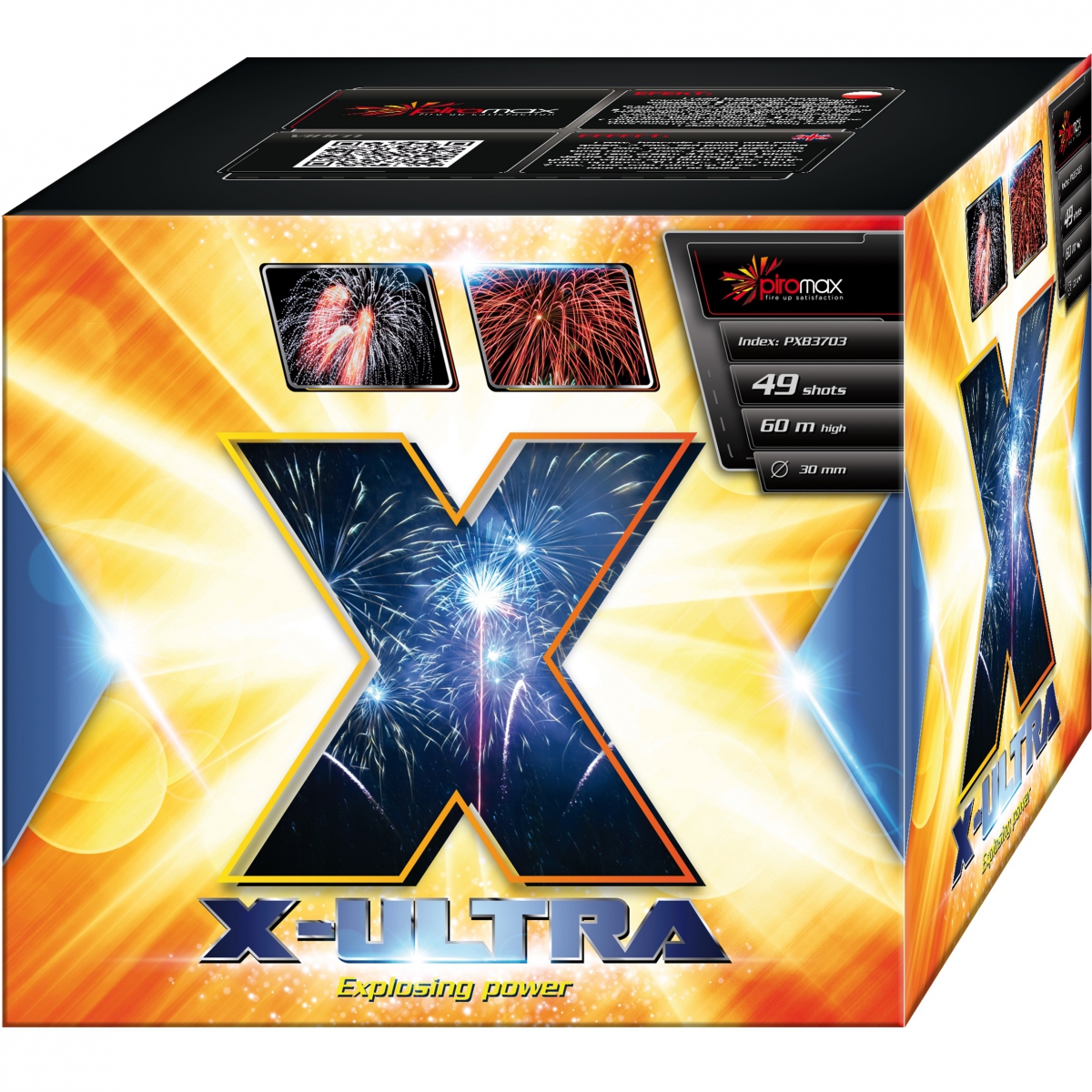 Bateria X-ultra 49-strzałowa Efekt: 1 rząd: brokatowe korony zakończone czerwonymi i zielonymi gwiazdami. 2 rząd: czerwone palmy kokosowe z iskrzącymi środkami przechodzące w złoty deszcz. Złote palmy kokosowe przechodzące w złoty deszcz. 3 rząd: czerwone i białe wierzby zakończone czerwonymi i zielonymi gwiazdami. 4 rząd: czerwone i błękitne dalie przechodzące w śnieżnobiałe migotanie. 5 rząd: złote wierzby, błękitne wierzby. 6 rząd: miny z chryzantemami rozrywające się na srebrne chryzantemy z głośnym hukiem. 7 rząd: złote miny przechodzące w złoty deszcz i złote wierzby