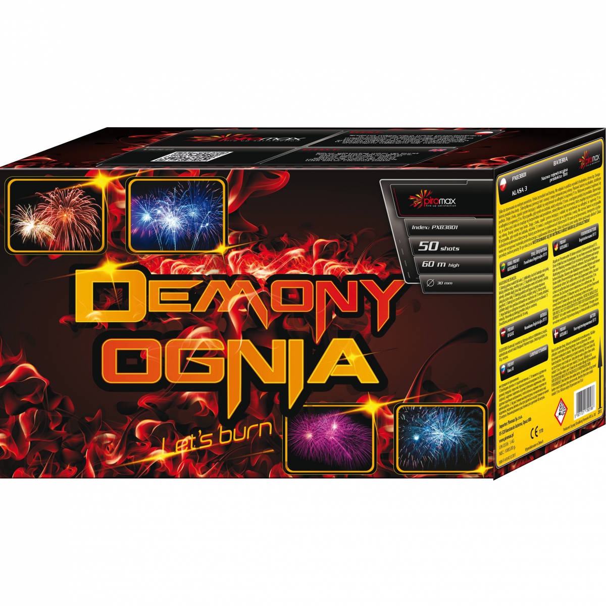 Bateria Demony ognia 50-strzałowa Efekt: srebrne migoczące miny zakończone czerwonym palmami kokosowymi ze srebrnym migotaniem, srebrne migoczące miny zakończone błękitnymi gwiazdami, srebrne migotanie przechodzące w tytanowe chryzantemy z pulsującymi środkami
